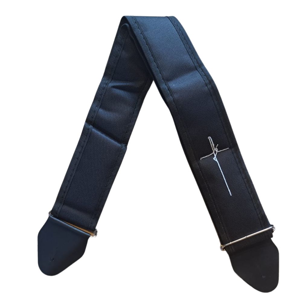 Com regulagem de comprimento, adapta-se facilmente a diferentes alturas e preferências, garantindo praticidade e firmeza durante ensaios e apresentações. Além de funcional, o detalhe bordado valoriza o instrumento e transmite personalidade ao músico.