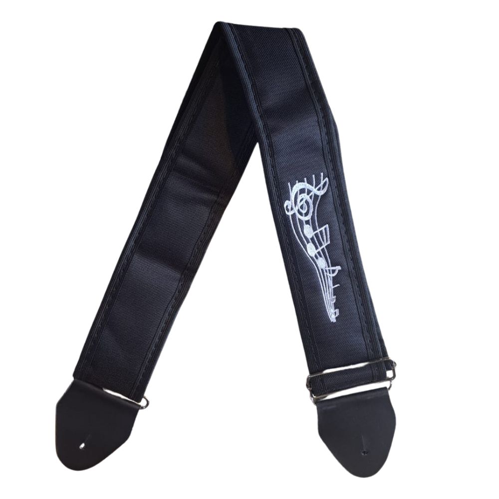Com regulagem de comprimento, adapta-se facilmente a diferentes alturas e preferências, garantindo praticidade e firmeza durante ensaios e apresentações. Além de funcional, o detalhe bordado valoriza o instrumento e transmite personalidade ao músico.