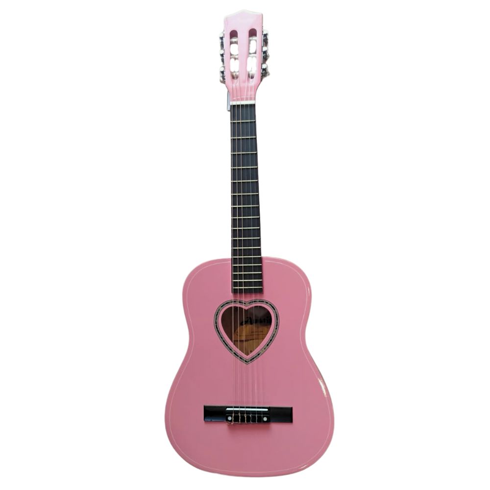 Um violão de tamanho reduzido (infantil / juvenil), indicado para crianças ou iniciantes que ainda têm mãos pequenas ou querem um instrumento mais leve e confortável para começar. Ele combina estética atraente (tom rosa / pink) com características técnicas simples e adequadas para aprendizado.